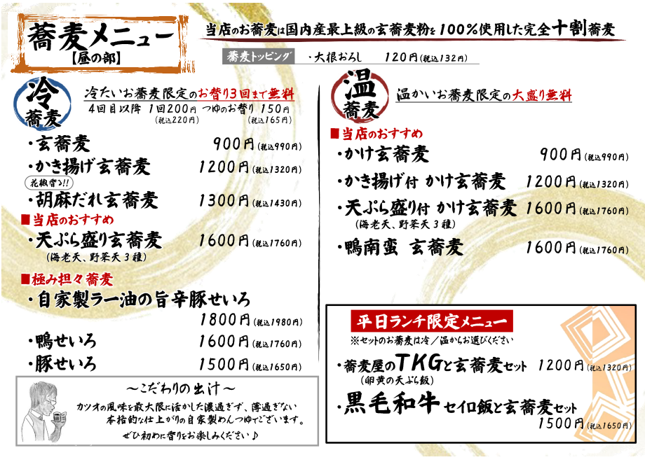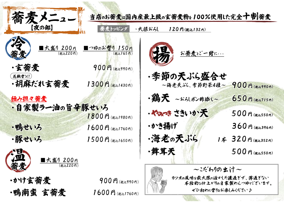 本当に美味しい十割そばを心おきなく楽しんでいただきたく玄蕎麦しんがり草加店では"おかわりのサービス(3回)"を始めさせていただきました!